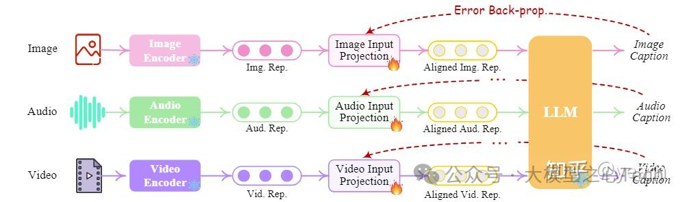 为了完成编码器对齐,作者从现有语料库和基准中准备了“X-caption”对(“X”代表图像、音频或视频,caption代表文字)数据,然后强制 LLM 根据标注caption生成每个输入模态的caption,学习过程如上图所示。