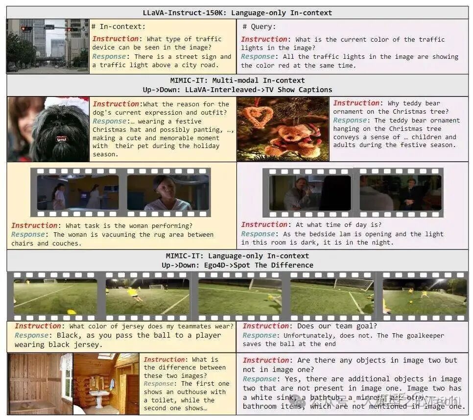 数据格式比较:LLaVA-Instruct-150K vs. MIMIC-IT。 (a) LLaVA-Instruct-150K由一张图片及其对应的仅包含语言的上下文信息(黄色框)组成。 (b) MIMIC-IT包含多个图片或视频的输入数据,并支持多模态上下文信息,即考虑图片/视频和语言输入作为上下文信息。