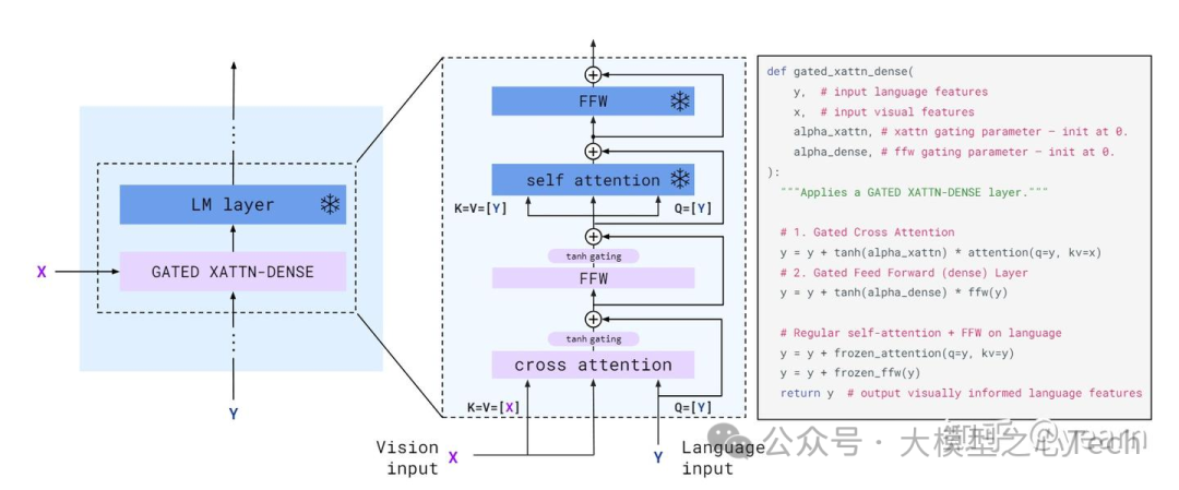 总的来说,首先,Perceiver Resampler接收来自视觉编码器的时空特征(从图像或视频获取),并输出固定数量的视觉标记。其次,这些视觉标记用于通过新初始化的交叉注意力层对冻结的语言模型进行条件化,这些层被插入到预训练的语言模型层之间。这些新层为语言模型提供了一种表达方式,以便将视觉信息纳入到下一个标记预测任务中