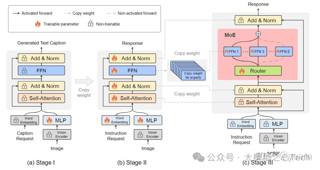 阶段一:在这个阶段,我们的目标是使图像标记适应LLM,使LLM能够理解图像中的实例。为了实现这一目标,我们使用MLP将图像标记投影到LLM的输入域中,将图像块视为伪文本标记。在这个阶段,LLM被训练来描述图像。MoE层在这个阶段不应用于LLM。