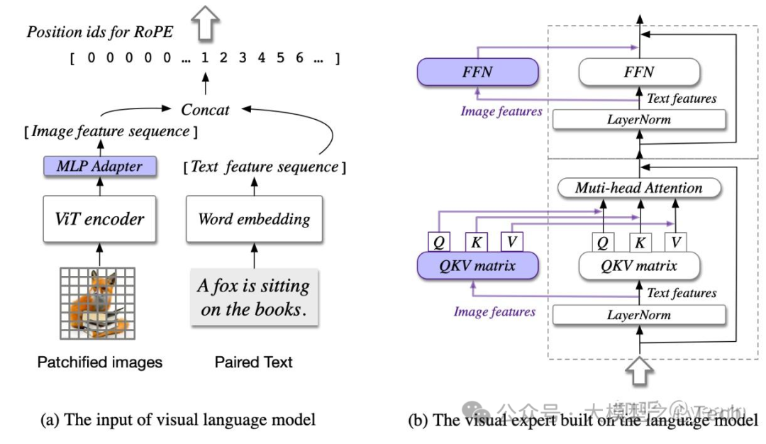 Visual expert module:在 LLM 的每一层中引入可训练的 visual expert,其包含专门处理 image feature 的「QKV矩阵」和「MLP层」,以实现深度的视觉-语言特征对齐。QKV矩阵和MLP的形状与预训练语言模型中的相同,并从中进行初始化。trainable visual expert 专门用于转换图像特征,功能上和 LLM QKV/MLP 一致,但是只针对 image feature,从而实现模态间的深度融合。