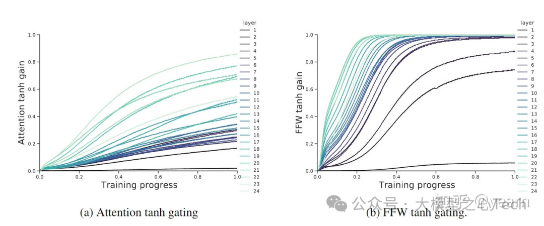 上图提供了一个GATED XATTN-DENSE块的示意图,以及它与一个冻结的LM块的连接方式,同时附上了伪代码。下图绘制了Flamingo-3B模型的24个LM层在训练过程中(从0%到100%)不同层中tanh门控值的绝对值的演变。冻结的LM堆栈的所有层似乎都利用了视觉信息,因为tanh门控的绝对值从其0初始化中迅速增长。我们还注意到,绝对值似乎随着深度增加而增加。然而,从这个观察中很难得出强有力的结论:门控之前的激活的规模也可能随着深度变化。未来的工作需要更好地理解这些添加层对优化动态和模型本身的影响。