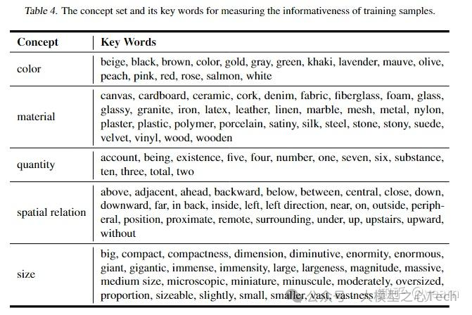 多样性。我们构建了一组与流行基准测试相匹配的关键概念,即MME和MMBench。具体来说,我们设计了几个高级概念,然后使用GPT-4生成每个概念的数十个关键词。然后,我们过滤掉在SVIT数据集中频率较低的那些关键词。概念集在上表中。我们通过与概念集的重叠来衡量每个训练样本的信息量,并选择最具信息量的样本。