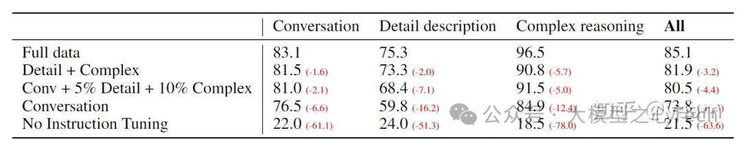 训练分两步,第一步做对齐,只训projection layer;第二步e2e finetune,vision encoder(clip vit-L)是freeze的。可以看到instruction tuning对任务效果影响巨大,另外每个任务本身的指令数据也对各个任务都有互补作用