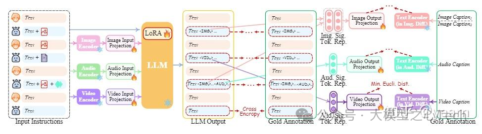 NExT-GPT基本思想是利用编码器对各种模态的输入进行编码,将其投影为LLM可理解的类语言表示。ExT-GPT利用现有的开源LLM作为核心,处理输入信息,进行语义理解和推理。LLM不仅直接生成文本标记,而且还产生独特的“模态信号”标记,这些标记作为指令来指示解码层是否要相应地输出什么模态内容。然后,生成带有特定指令的多模态信号,经过投影后传输到不同的编码器,最终生成相应模态的内容。