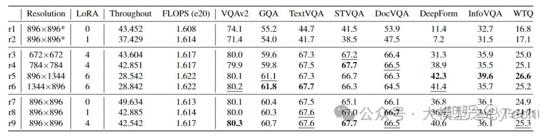 提高分辨率能提高模型性能(r3-r9),四个LoRA能够帮助模型获得图像中不同部分的独特特征(r7 vs. r9),并帮助模型建立对空间和上下文关系的理解。进一步提高输入分辨率能够提高模型在文档等更高分辨率的图像上的性能(r5,r6)。同时,相比与直接插值扩大模型输入分辨率的方法相比(r1,r2 vs. r9),本文的方法在时间和性能上更具优势。表六中当把llava1.5的输入分辨率从224扩大为448,性能得到显著提升,进一步展现了本文方法的有效性。