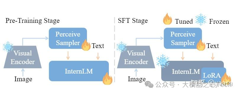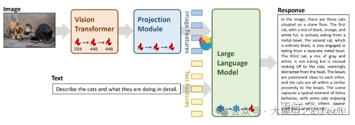 第2阶段:ViT的图像分辨率扩展到448×448,并训练ViT和投影模块的参数。它旨在进一步提升模型对复杂视觉细节的识别能力。此阶段使用的数据集包括约2500万个图像-文本对,例如LAION-400M、CLLaVA、LLaVAR、Flickr、VQAv2、RefCOCO、Visual7w等。