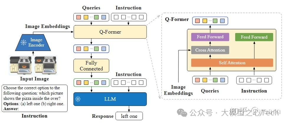 视觉编码器提取输入图片的特征,并喂入 Q-Former 中。此外,Q-Former 的输入还包括可学习的 Queries (BLIP-2 的做法) 和 Instruction。Q-Former 的内部结构黄色部分所示,其中可学习的 Queries 通过 Self-Attention 和 Instruction 交互,可学习的 Queries 通过 Cross-Attention 和输入图片的特征交互,鼓励提取与任务相关的图像特征。