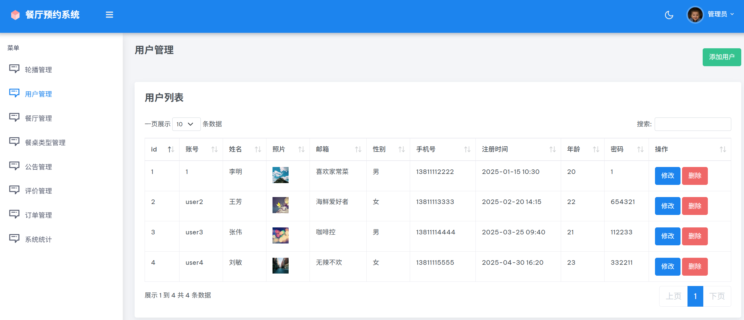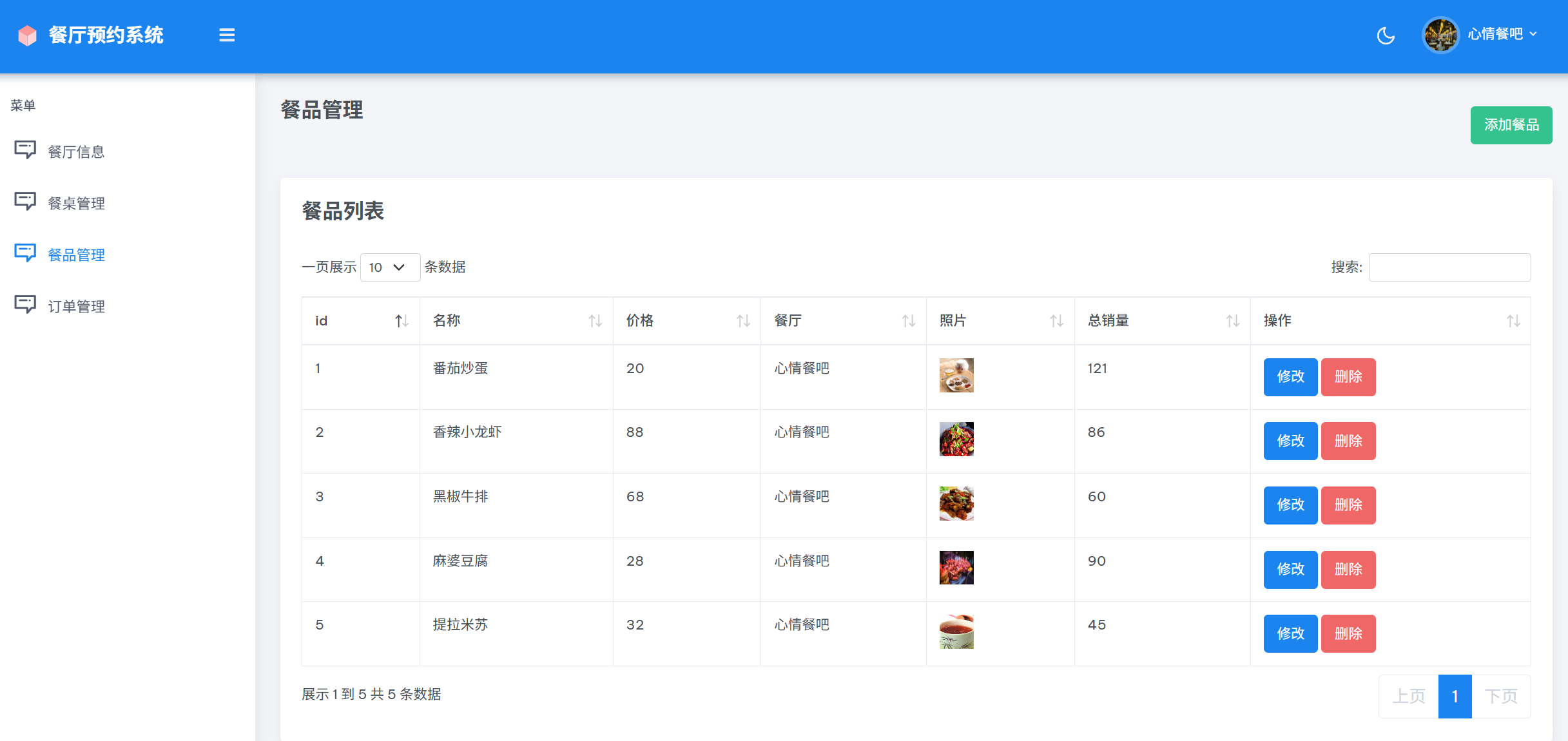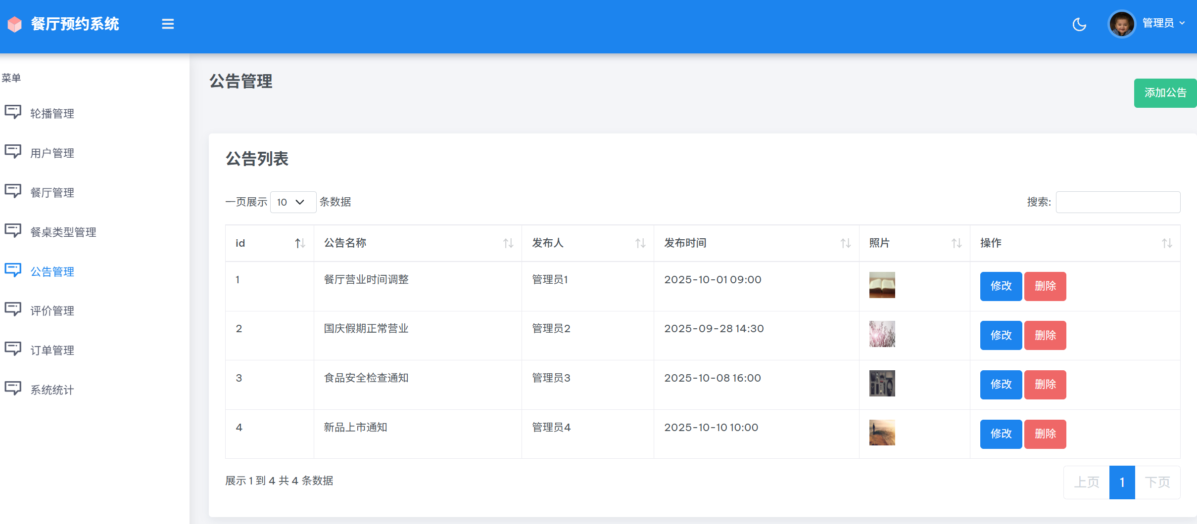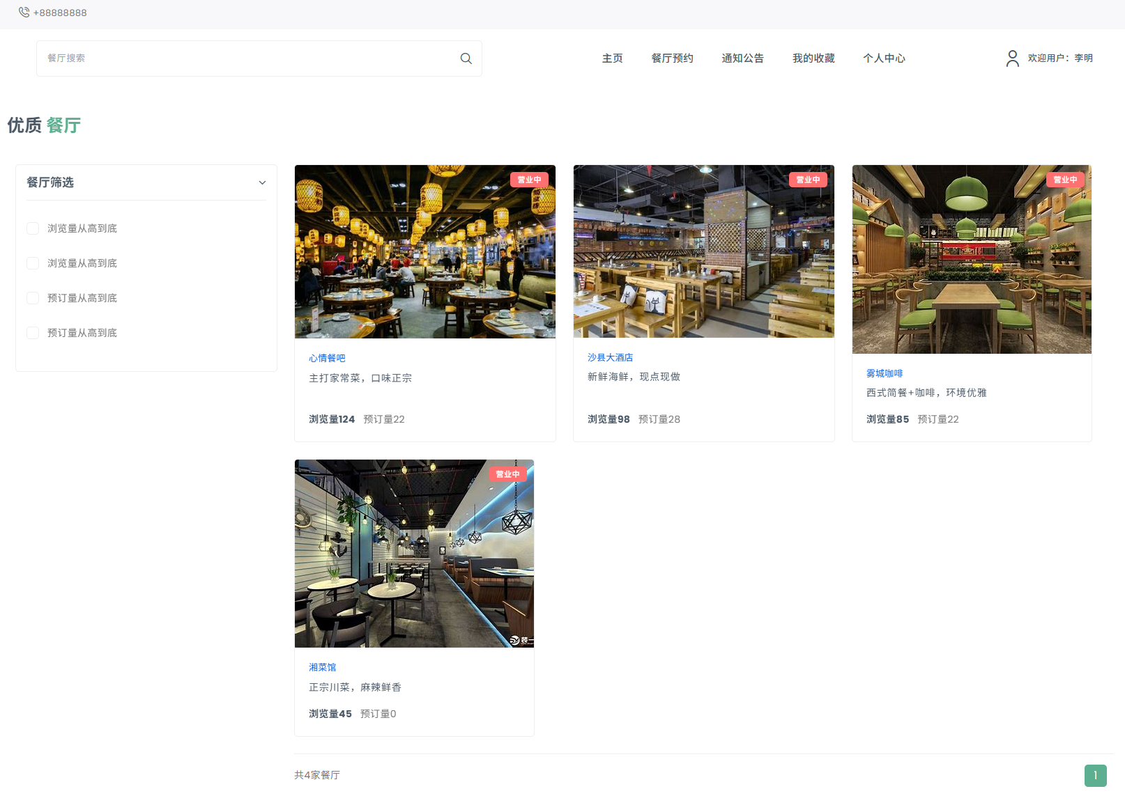 主要功能介绍:基于Java的餐厅预约系统,系统后端采用SpringBoot完成接口的设计。系统角色划分为管理员、用户以及餐厅经营者三大类,核心功能是实现在线预订餐厅以及点餐下单。系统功能涵盖用户管理、餐厅信息管理、菜品管理、餐厅预订、在线点餐、订单管理等环节。系统的核心数据通过MySQL存储,并在网站页面内直观地进行展示。