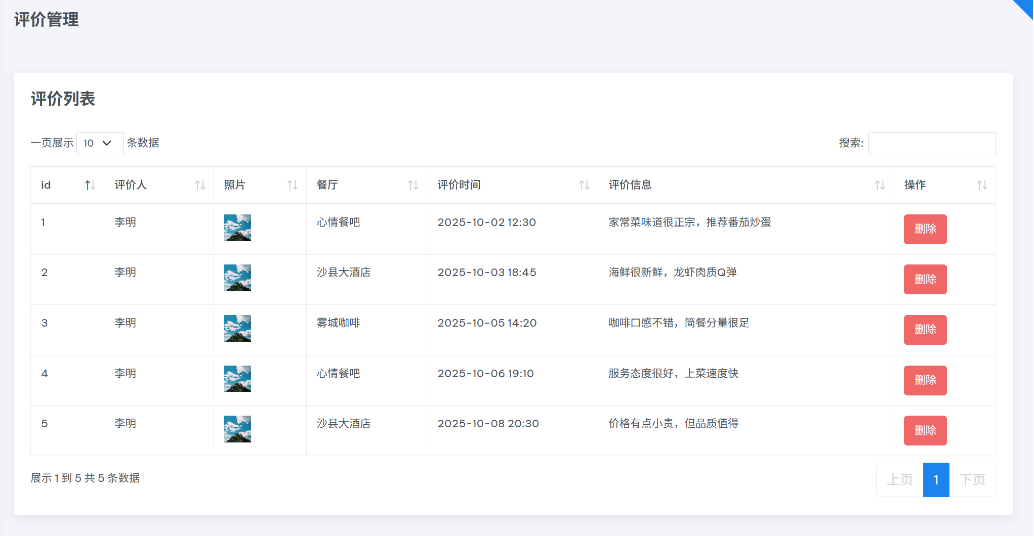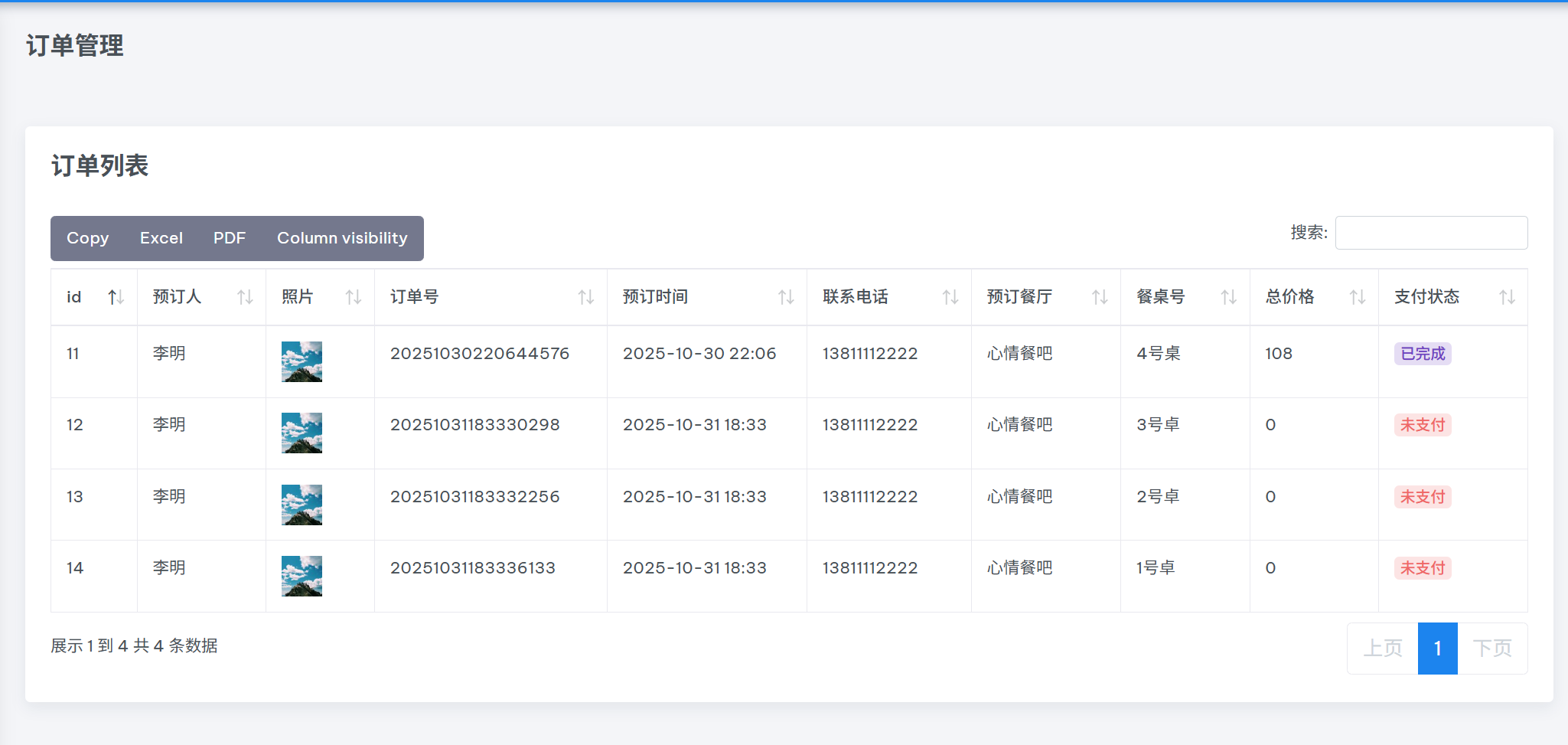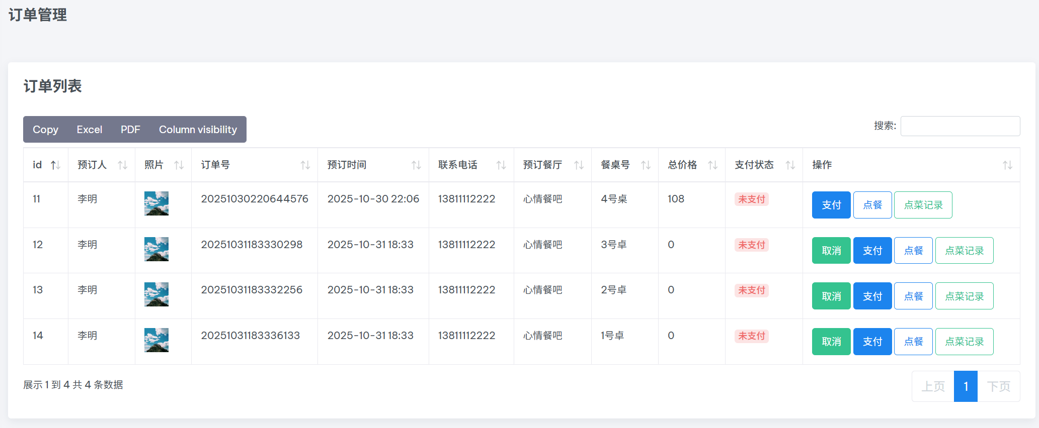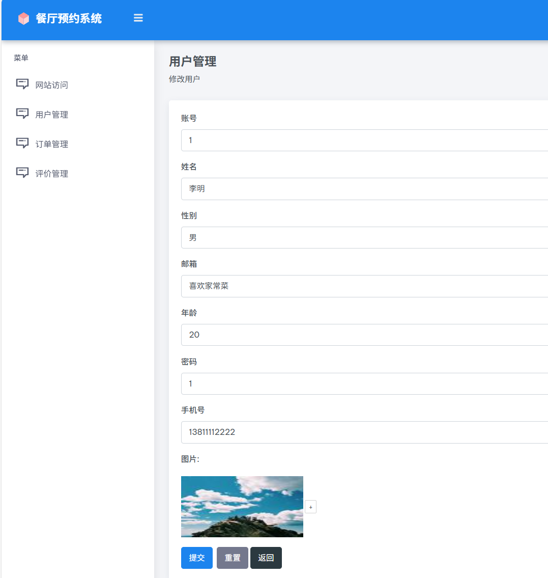 主要功能介绍:基于Java的餐厅预约系统,系统后端采用SpringBoot完成接口的设计。系统角色划分为管理员、用户以及餐厅经营者三大类,核心功能是实现在线预订餐厅以及点餐下单。系统功能涵盖用户管理、餐厅信息管理、菜品管理、餐厅预订、在线点餐、订单管理等环节。系统的核心数据通过MySQL存储,并在网站页面内直观地进行展示。