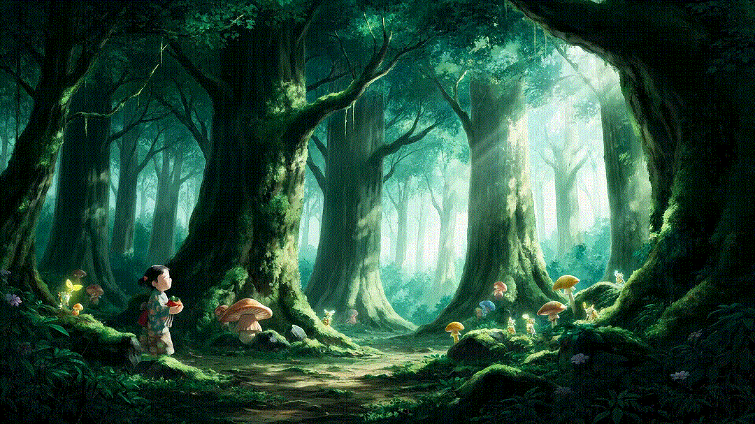 Prompt: A breathtaking, painterly 2D animated continuous visual narrative, rendered with the lush, vibrant, and slightly surreal, almost dreamlike, infused with the intricate, delicate detail of traditional Japanese woodblock prints (Ukiyo-e), follows a young, adventurous, and kind-hearted girl (perhaps with bright, curious eyes and wearing simple, practical, beautifully patterned traditional Japanese farm attire) as she befriends a colossal, gentle, ancient Forest Spirit. The Spirit is a magnificent, awe-inspiring creature, its form a harmonious blend of animal and plant – perhaps with moss-covered, antler-like branches, fur like shimmering leaves that change color with its mood, and eyes like deep, tranquil forest pools. They meet in a sun-dappled, sacred grove deep within an ancient, primeval forest, where impossibly tall, gnarled trees form a living cathedral and tiny, glowing, friendly forest sprites (Kodama-like) peek from behind mossy rocks and giant, fantastical mushrooms. The girl, initially awestruck, offers the massive Spirit a small, carefully cultivated offering – perhaps a perfectly ripe persimmon or a handful of wild berries – her gesture one of pure, innocent respect and affection. The Forest Spirit responds with a slow, gentle inclination of its massive head, its leafy fur rustling like a thousand whispers, and perhaps causes a shower of magical, luminous flower petals to drift down from the canopy, or a tiny, new sapling to sprout at the girl's feet. The animation captures the incredible, detailed textures of the forest, the Spirit's majestic yet gentle presence, and the profound, unspoken emotional connection forming between the child and this ancient guardian of nature. The color palette is a rich symphony of deep forest greens, earthy browns, vibrant floral hues, and the soft, magical glow of the sprites and the Spirit's own subtle luminescence. This continuous, sweeping visual journey is a celebration of the profound, often mystical, bond between humanity and nature, the innocence and courage of childhood, and the power of kindness and respect to bridge even the most fantastical of divides, an affectionate, visually intoxicating ode to ecological harmony and interspecies understanding. The only implied sounds are the gentle rustling of leaves, the distant calls of unseen forest birds, the girl's soft, respectful breathing, the Spirit's deep, resonant, almost inaudible hum, and a soaring, emotionally resonant, orchestral score.