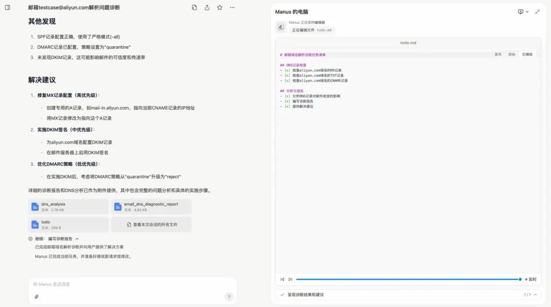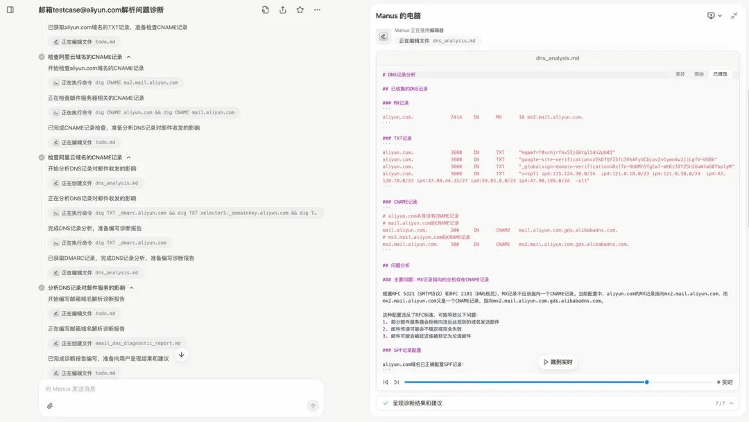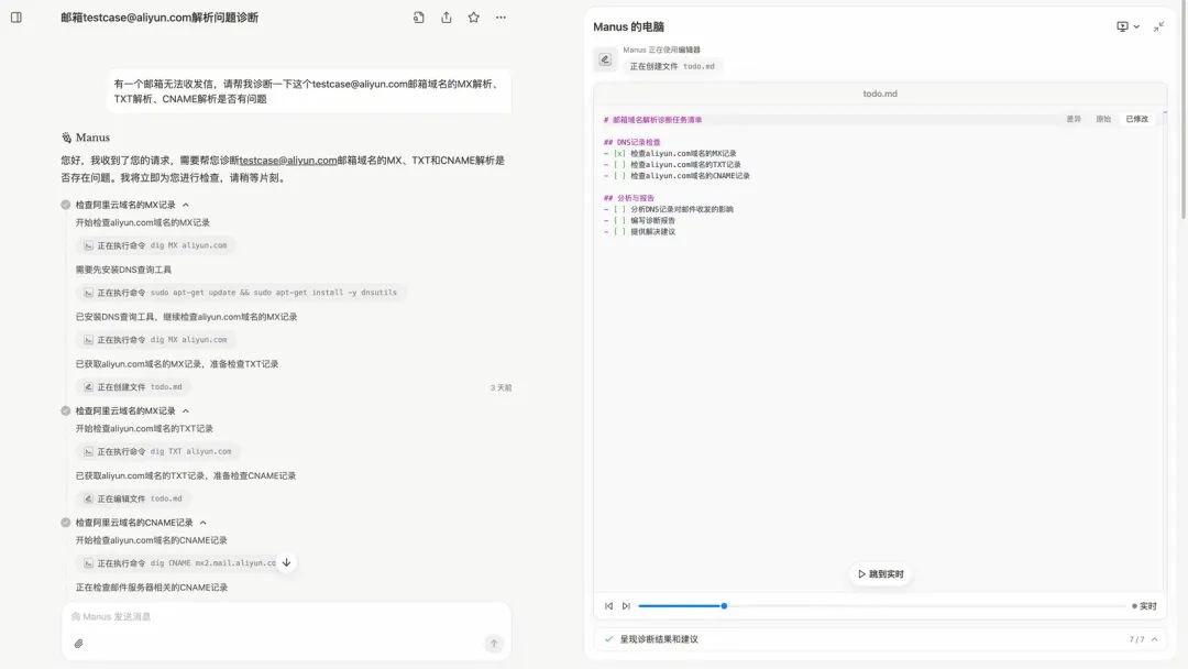 我们以实际运行的阿里云邮箱域名解析诊断为例子,看下Manus的自主思考逻辑。