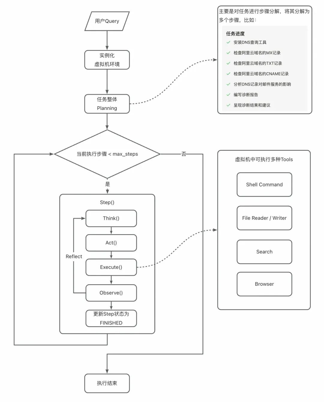 比如,测试同样的邮箱域名解析检测逻辑,基本实现了多步调用命令工具的过程,并且根据调用结果模型总结出了相应的原因分析和解决方案,可以说简单的复刻了Manus的效果,基本上有那味了:
