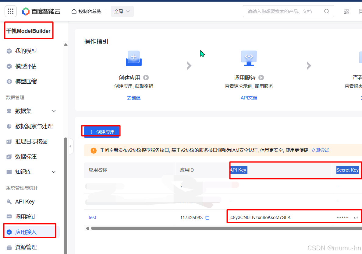 它的获取秘钥位置在:“千帆ModelBuilder”-----》“应用接入”-----》“创建应用”,如图下是对应的AK和SK秘钥。