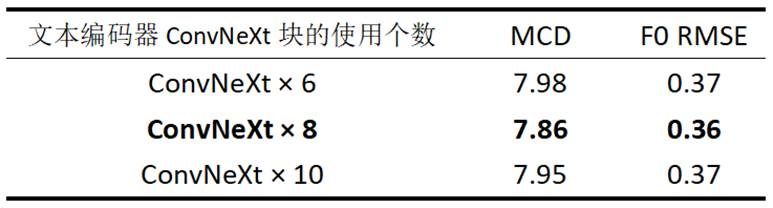 表3 文本编码器ConvNeXt块的使用个数消融实验MCD和F0 RMSE客观评估表