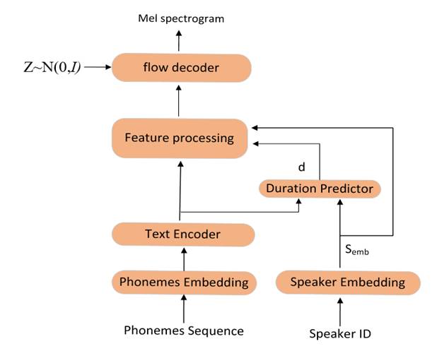 在推理时,文本编码器(Text Encoder)与在训练时一样,将音素嵌入编码为隐藏向量Tenc,其次,持续时间预测模块(Duration Predictor)根据说话人信息Semb和文本隐藏向量Tenc预测出每个文本的持续时长信息d,在推理阶段,特征处理(Feature processing)模块中的长度调节器根据持续时长信息d将文本隐藏向量Tenc在文本长度维度上进行扩展,得到形状大小为[B,C,Tmel]的隐藏向量Context,接下来特征处理模块(Feature processing)中的双向LSTM会对隐藏向量Context和说话人信息在编码维度上进行拼接在一起的变量进行处理,处理的结果传递到flow decoder之中。随后,flow decoder将特征处理模块(Feature processing)的输出和一个简单的标准正态分布Z经过一系列可逆的变换来逐渐将一个简单的标准分布转换成一个复杂的分布,即mel谱图。最后将解码出的mel谱图送入到HiFi-GAN声码器中,将mel谱图解码为语音波形。