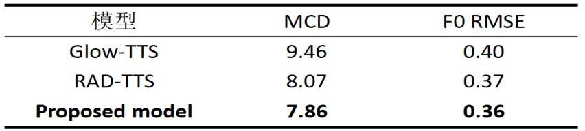 其客观评估实验结果如表2所示,本文所提出的模型优于RAD-TTS[5]和Glow-TTS[9]模型。