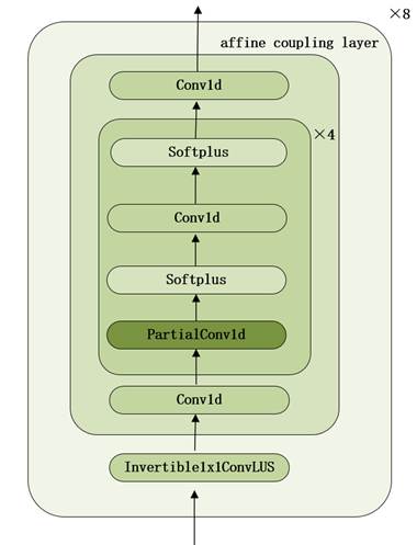 使用基于Glow[9]的二分流架构(bipartite-flow architecture),作为模型的解码器,其中流的每一步都是一个1×1可逆卷积(Invertible1×1ConvLUS)[10]与一个仿射耦合层(affine coupling layer)[11]构成。采用流的结构,在训练阶段,能够学习到一系列的可逆变换,将复杂的数据分布(如mel谱数据)转换为一个简单的已知分布(如标准正态分布)。在推理阶段,当给定一个输入(如标准正态分布),模型可以通过应用学习到的可逆变换的逆变换,逐步将一个简单的标准正态分布其转换为接近真实mel谱数据的分布。解码器的结构如图11所示: