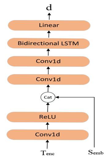 在推理时,mel谱的长度是未知的,所以在训练阶段,需要训练一个持续时间预测模块,以便在推理时,获得持续时间信息。时长预测模块主要是由1维卷积(Conv1d)、ReLU、双向的LSTM(Bidirectional LSTM)和线性层(Linear)组成。在训练时,使用均方误差(Mean Squared Error, MSE)损失来计算Ahard_sum和d之间的损失。Ahard_sum是由Ahard在第二个维度上进行求和操作得到,其形状大小为[B,Ttext]。Ahard_sum中的每个分量的值表示每个文本的时长信息。。持续时间预测模块如下图10所示: