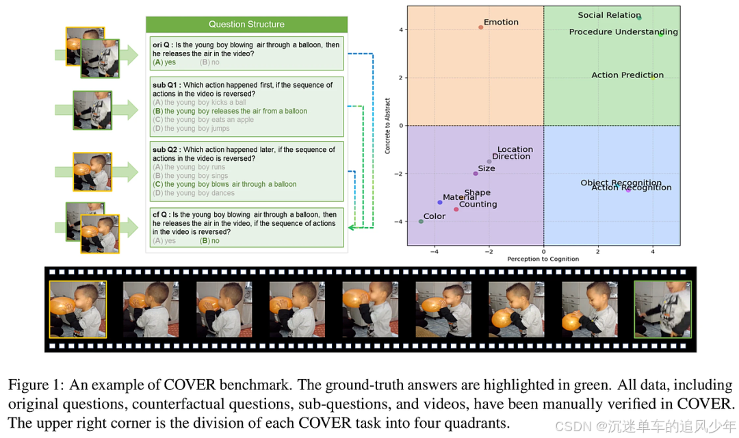 COVER基准通过以下几个步骤构建:首先,基于抽象-具体和感知-认知的维度,将任务分为四个象限,每个象限对应不同的推理能力评估。然后,设计了13个具体任务,以评估模型在复杂视频场景下的多样推理能力。接着,COVER引入了子问题推理机制,允许将复杂问题分解为多个必要条件,从而进行更深入的性能评估。最后,通过严格的数据验证过程,确保了数据的高质量和可靠性。通过这种方式,COVER不仅能够评估模型在反事实推理中的表现,还能揭示模型在应对动态变化时的优势和不足。