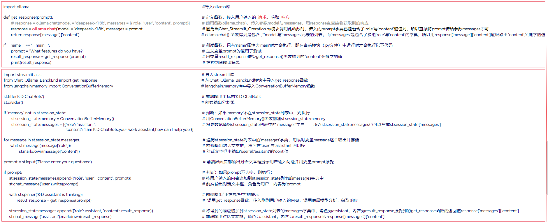 response = ollama.chat(model='deepseek-r1:8b', messages=prompt[-30:]) # 因为当Chat_Streamlit_Oreration.py模块调用此函数时,传入的prompt字典已经包含了‘role’与‘content'键值对,所以直接将prompt传给参数messages即可