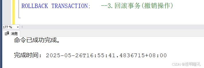 ROLLBACK TRANSACTION; --3.回滚事务(撤销操作)