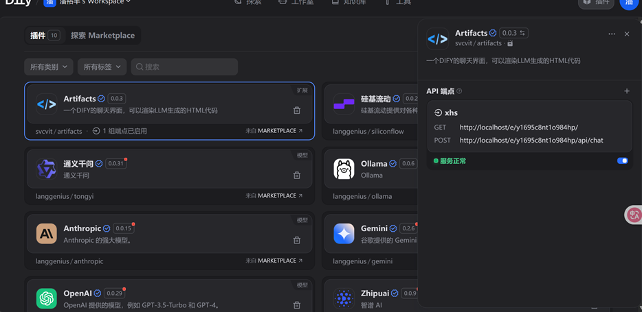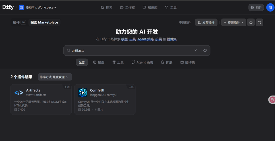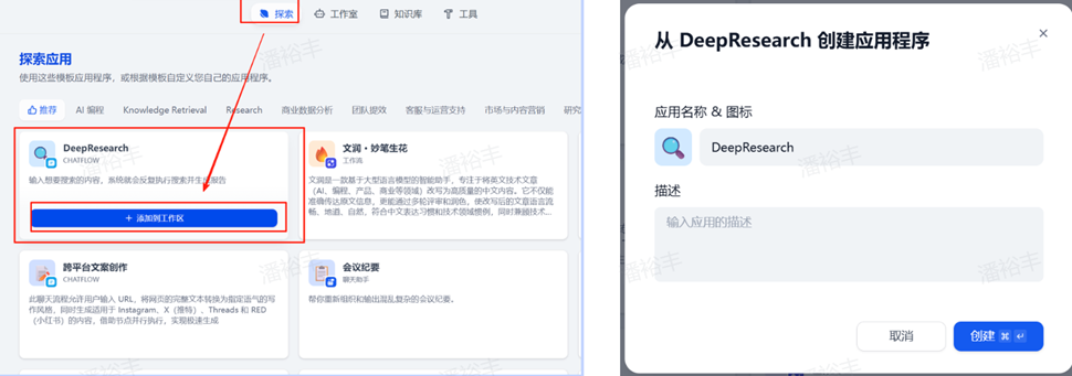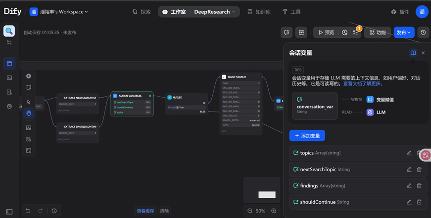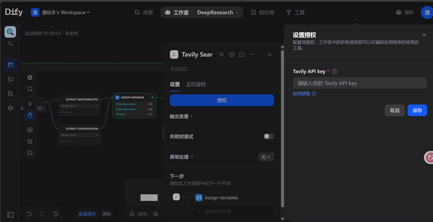 第一步:在dify搜索市场中找到deep search并添加到工作区,安装好相关插件后会打开工作流。