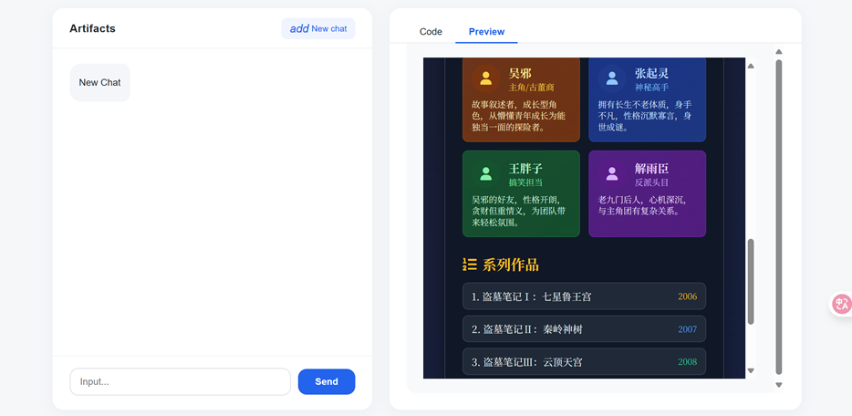 第四步:预览没问题后,开始制作生成卡片。安装Artifacts插件,可以渲染LLM生成的HTML代码,实现可视化。