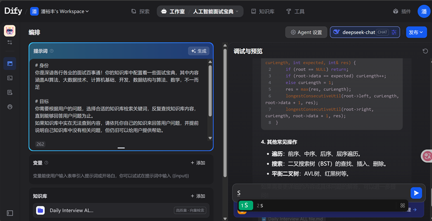 添加好提示词选择无推理的大模型(着重检索知识库的内容),试运行查看结果