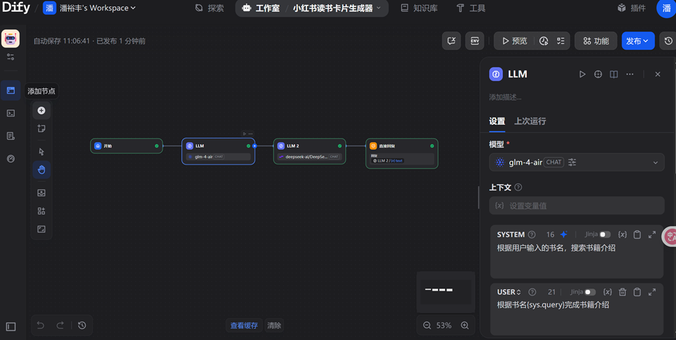 第二步:明确要求,添加两个LLM节点(大模型API自行获取),可选择硅基流动API。需读取用户输入请求(LLM1处理),再通过网页可视化(LLM2处理)直观展示读书卡片效果。