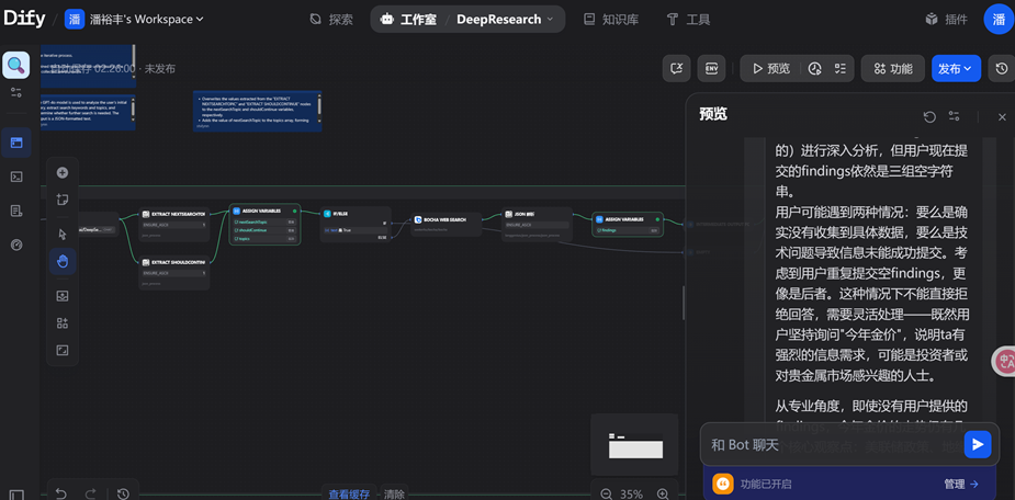 摘要:本文介绍了Dify平台的进阶应用,包括工作流和Chatflow的使用方法。以小红书读书卡片生成器为例,详细说明了创建流程:从添加LLM节点、设计提示词到使用Artifacts插件实现可视化。同时展示了面试宝典Agent的创建过程,涉及知识库导入和检索测试。最后探讨了DeepSearch的设计理念与应用场景,并演示了如何在Dify中实现深度查询功能,包括轮数设置和查询主题输入,特别说明了国内L