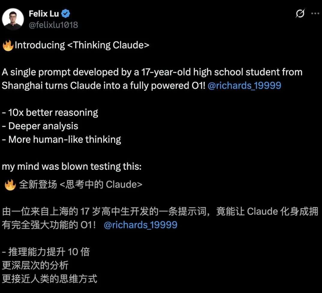 去年,涂津豪还通过神级提示词工程把Claude 3.5改造成推理模式。