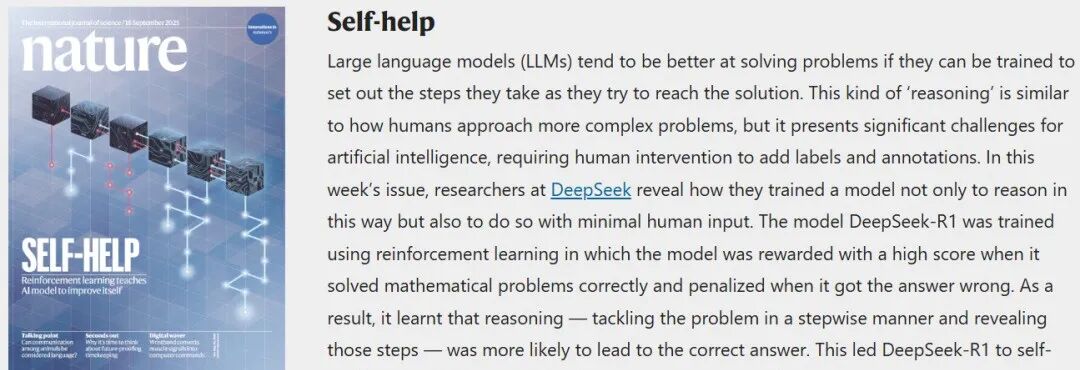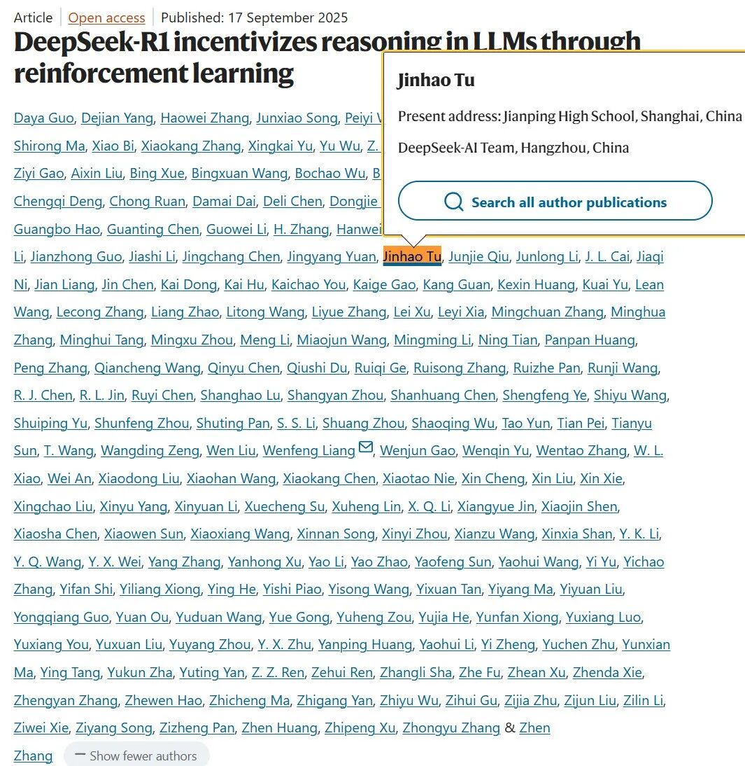 DeepSeek-R1荣登Nature封面,成为史上首个经严格同行评议的大模型。年仅18岁的天才少年涂津豪作为作者之一,以实习生身份参与其中,他的故事从高中生到Nature作者,堪称励志传奇。