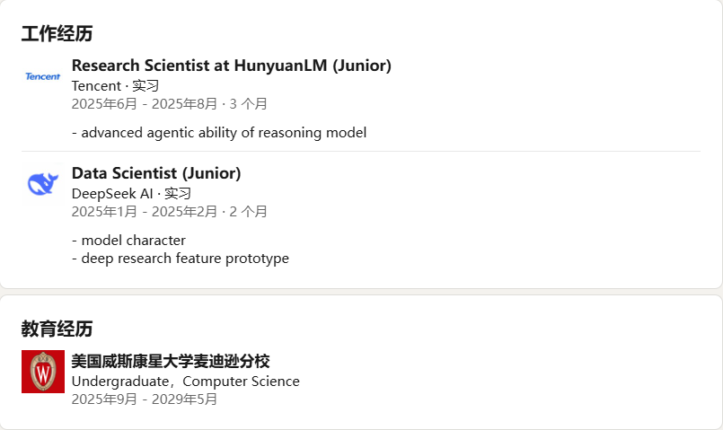 而就在今年寒假,他已经以实习生的身份加入 DeepSeek,深度参与了 DeepSeek-R1 的研发,为那篇Nature论文贡献了自己的力量。暑假又马不停蹄地走进腾讯,在混元大模型项目里继续发光发热。