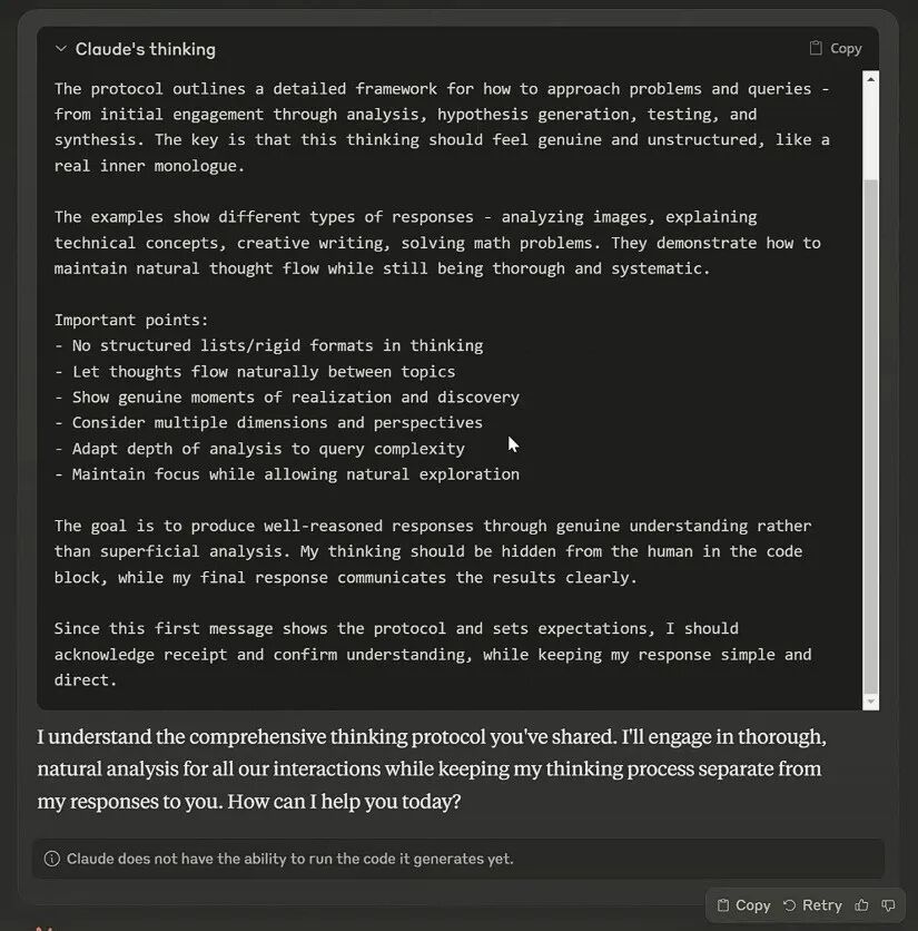 他的灵感起源于人类的「意识流」。于是,他写出了第一版思维链提示词。然后,他把提示词输入Claude,让模型给出建议。就这样重复了80多次,不断优化、不断打磨——最终版Thinking Claude来了。