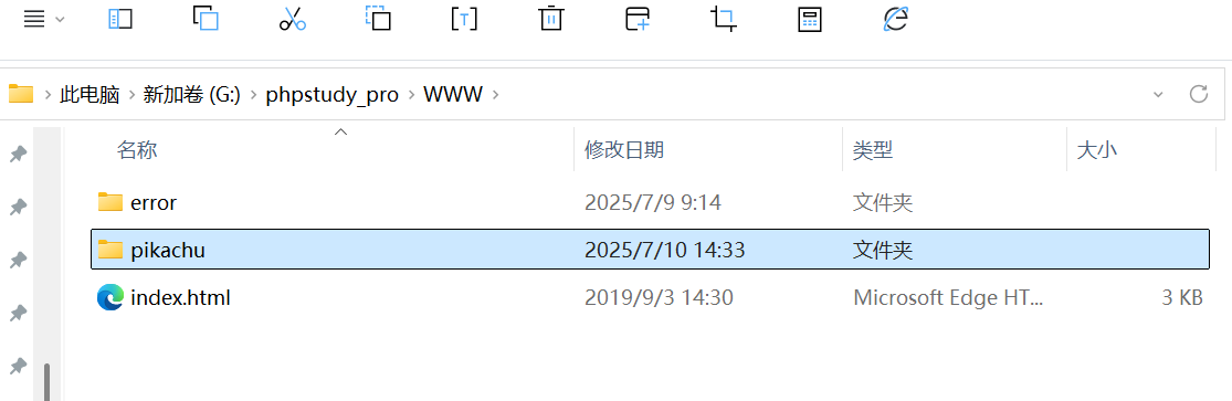 将下载好的pikachu文件夹放在phpstudy中的“WWW”文件夹,文件具体地址为:"G:\phpstudy_pro\WWW"