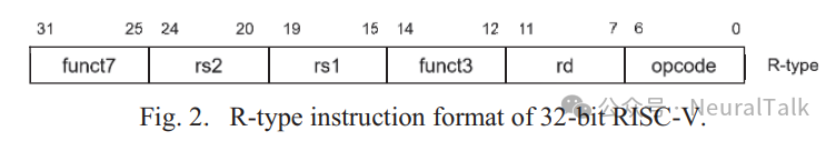 为 CFU 分配了多个自定义的 R 型指令(图 2 展示了 32 位 RISC-V 的 R 型指令格式),以扩展原始的 32 位 RISC-V ISA(指令集架构)。