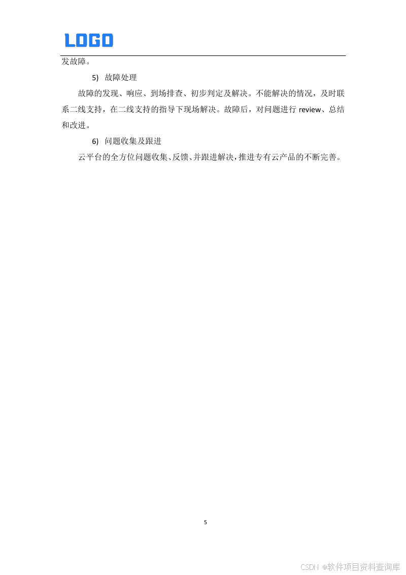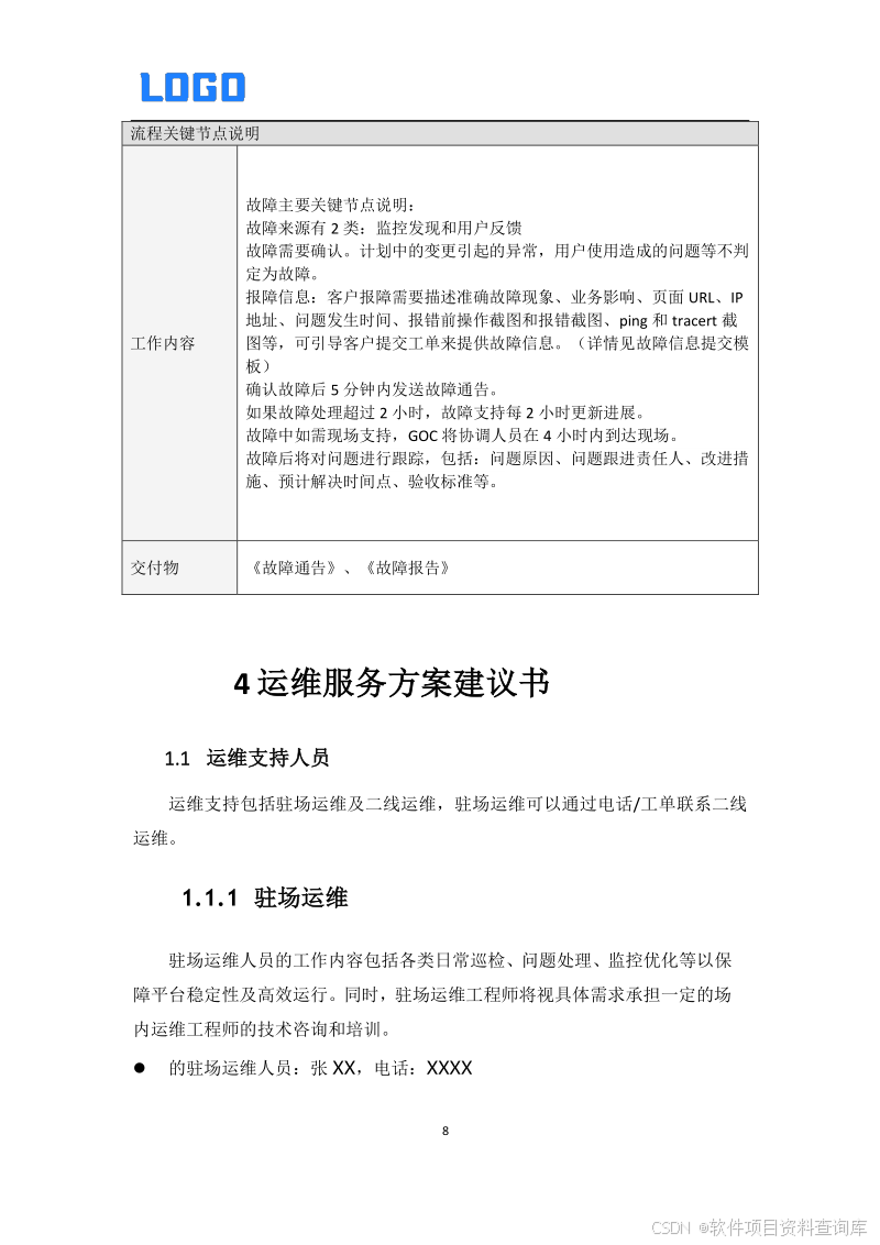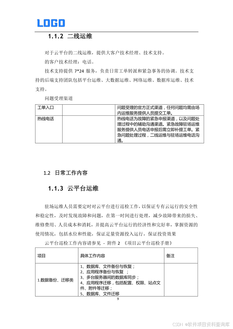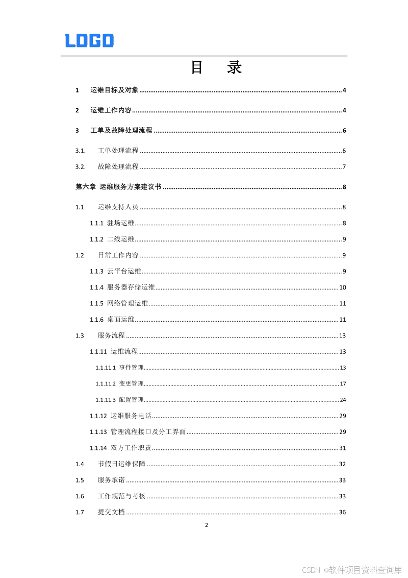 1 运维目标及对象 2 运维工作内容 3 工单及故障处理流程 3.1. 工单处理流程 3.2. 故障处理流程 第六章 运维服务方案建议书 1.1 运维支持人员 1.1.1 驻场运维 1.1.2 二线运维 1.2 日常工作内容 1.1.3 云平台运维 1.1.4 服务器存储运维