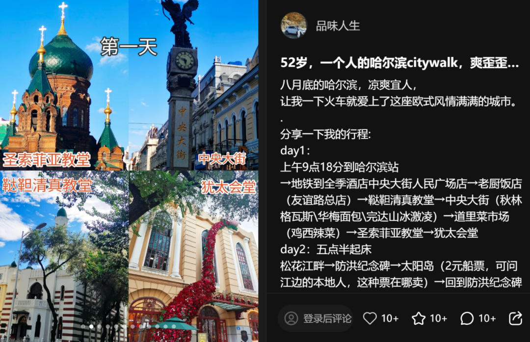 在一篇哈尔滨游记中,“品味人生”用文字记录了每一天的详细行程,并附上自己此次出游的心得,同时搭配10+张图片,每张都以拼图+文字的形式呈现,尽可能多方位展现出行程中的高光亮点。