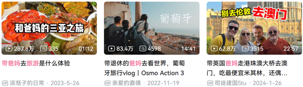 而在抖音、B站等平台搜索“带爸妈去旅行”关键词,出现在搜索结果前列的几条视频播放量均达到了100w+,其中一些内容以第一人称视角浓缩记录陪父母city walk的经历,另外一些爆款内容则以父母视角记录旅行感悟与心得,通过子女的镜头记录父母旅途中的反应、感受与互动。