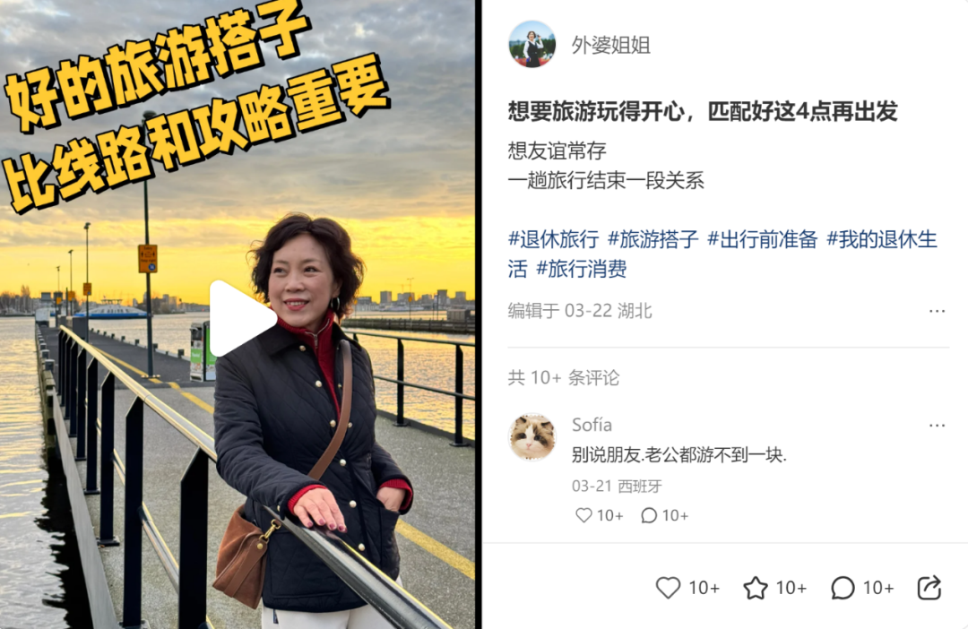 “退休旅行如何选择旅游搭子,首先需要消费观一致,其次兴趣相投,最后体力要匹配……”小红书平台上,拥有4w+粉丝的58岁旅游博主“外婆姐姐”,通过短视频向网友分享自己过往的旅行经历,同时强调中老年出游时选择旅行搭子的重要性。