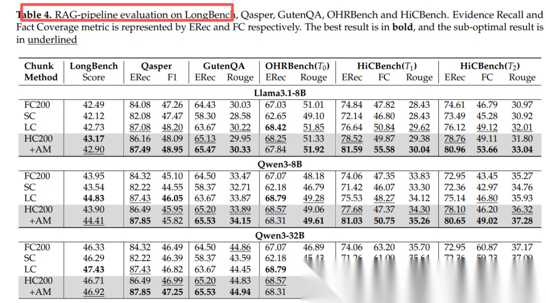 - 表3:HiChunk 在域内/域外均显著优于语义相似度或 LLM 单级切分。*