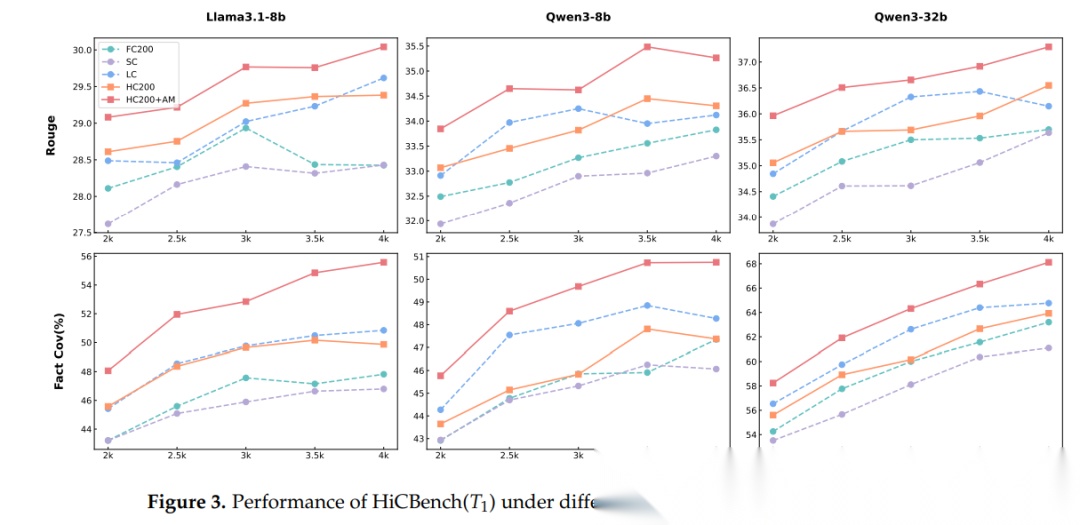 图3:2 k→4 k token 预算下,HC200+AM 的 Rouge、Fact-Cov 全程高于其他切分策略。