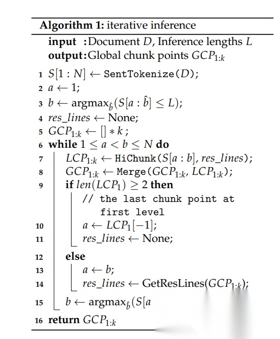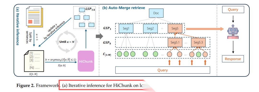 图2(a) 迭代推理:每次只看 8 k token,滑动窗口产生局部切分点,再 Merge 到全局树,解决“层次漂移”。