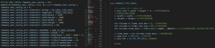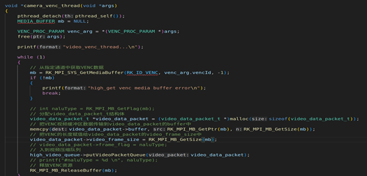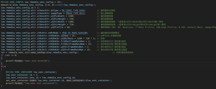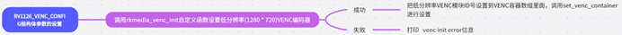 2.1.3. VENC模块初始化(分别是高、低分辨率):初始化高、低分辨率VENC硬件编码器,这里的编码器主要针对的是1920 * 1080和1280 * 720两种分辨率,具体的高分辨率VENC模块初始化在rkmedia_venc_init里面。