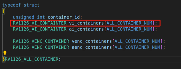 RV1126_ALL_CONTAINER结构体里面包含了四个模块的数组存储分别是VI模块(vi_contaianers)、AI模块(ai_containers)、VENC模块(venc_containers)、AENC模块(aenc_containers)。这四个模块容器就是分别存储,四个模块的ID号,让其能够更加方便的管理起来。