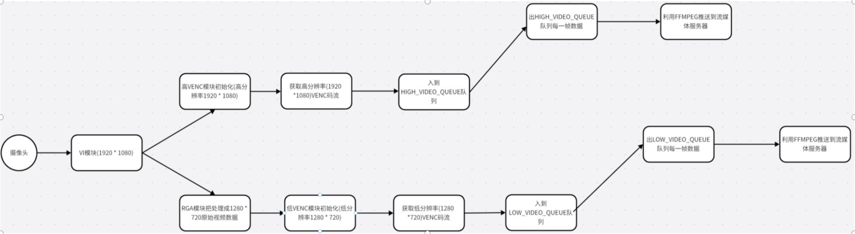 这个函数主要进行多路码流推流的业务实现,这里面包含了:init_rkmedia_ffmpeg_context分别初始化高分辨率的ffmpeg推流器和低分辨率的ffmpeg推流器、创建camera_venc_thread线程、创建get_rga_thread线程、创建low_camera_venc_thread线程、创建high_video_push_thread线程、创建low_video_push_thread线程