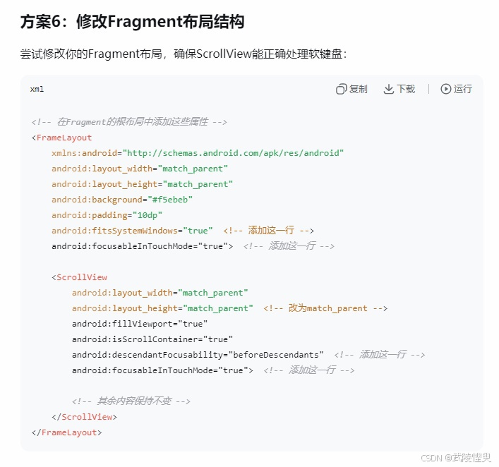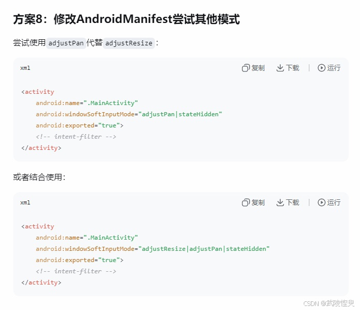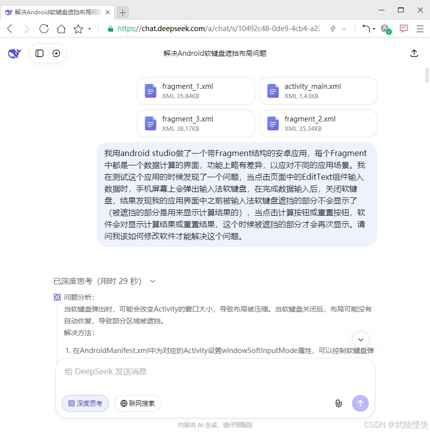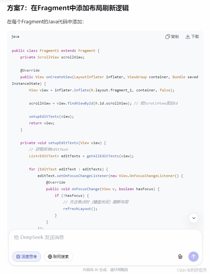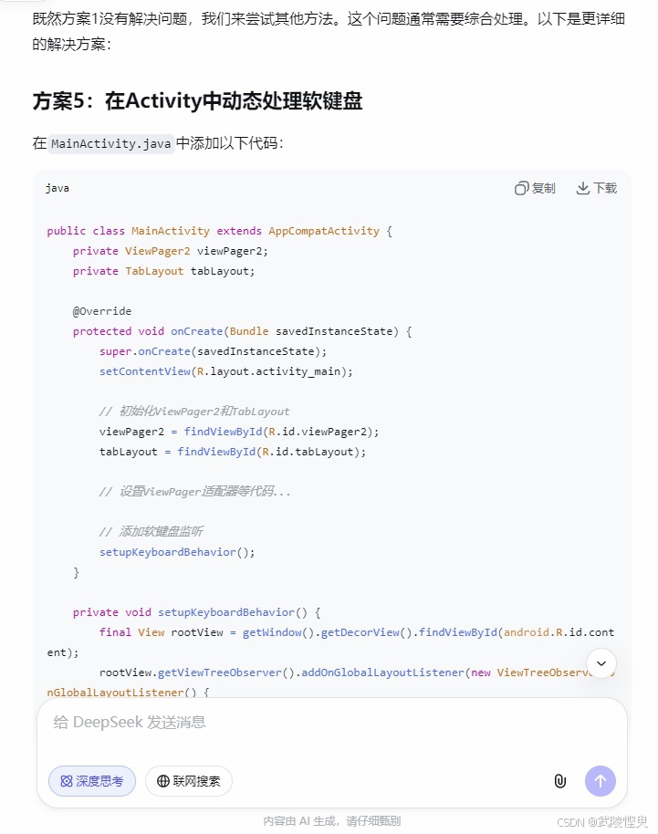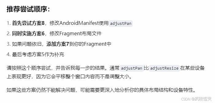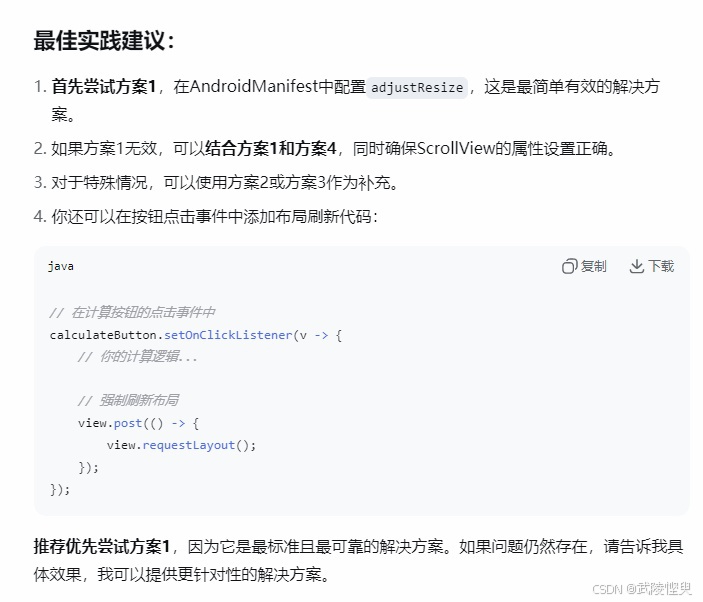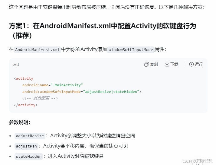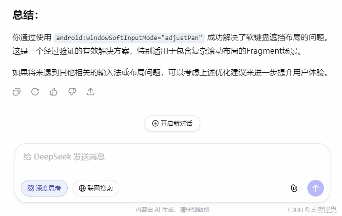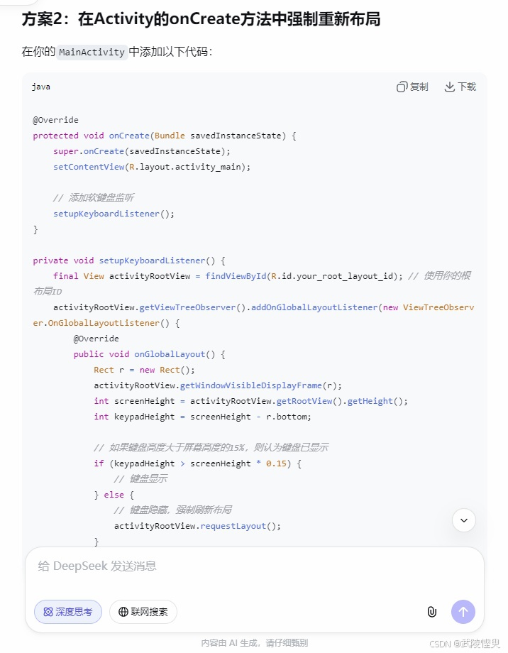 经过分析,DeepSeek认为当软键盘弹出时,可能会改变Activity的窗口大小,导致布局被压缩。当软键盘关闭后,布局可能没有自动恢复,导致部分区域被遮挡。DeepSeek提供了四个解决方案,并推荐优先使用方案1。