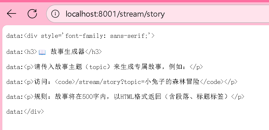 "<p>访问:<code>/stream/story?topic=小兔子的森林冒险</code></p>",