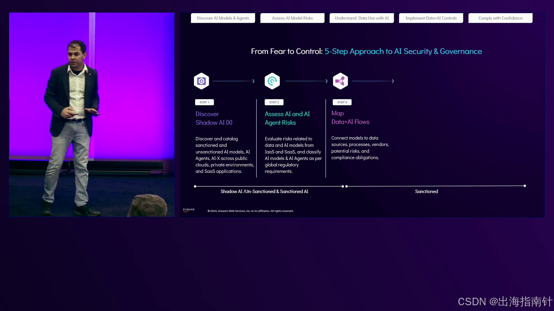 演讲者重申了五步框架,强调第1-3步致力于获得对模型的可见性、评估风险并理解数据暴露情况。第4步和第5步涉及实施适当的控制措施,并确保合规性是安全措施实施的自然副产品。